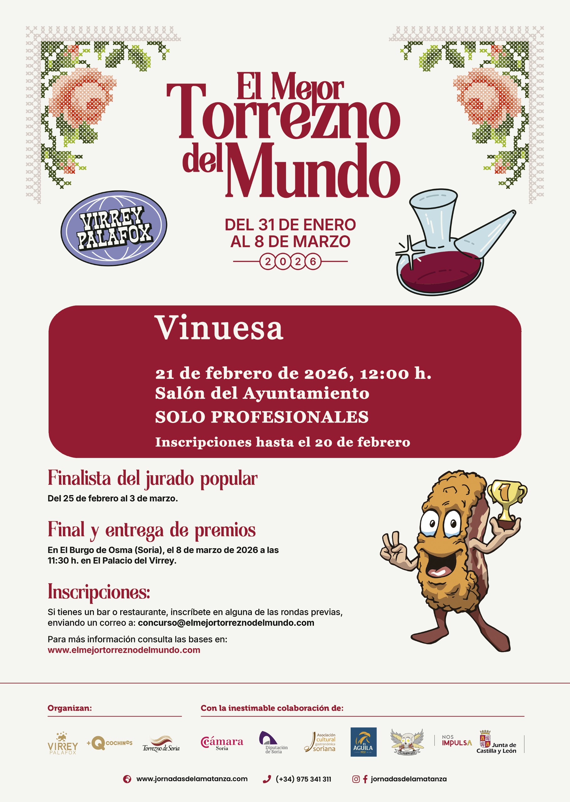 Sábado, 21 de Febrero de 2026 EL MEJOR TORREZNO DEL MUNDO Podrán competir bares y restaurantes Fecha: 21 de febrero Hora: 12:00h Lugar: Salón del Ayuntamiento de Vinuesa Comparte esta Página