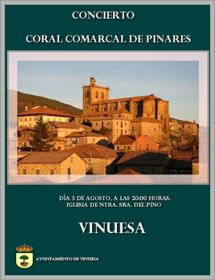 Como años anteriores, ya va siendo tradición el concierto de la Coral Comarcal de Pinares en nuestra localidad. Tendrá lugar el Sábado día 3 de Agosto en la Iglesia de Nuestra Señora del Pino. En esta edición, tendremos el placer de escuchar nuestro Himno visontino de nuevo.