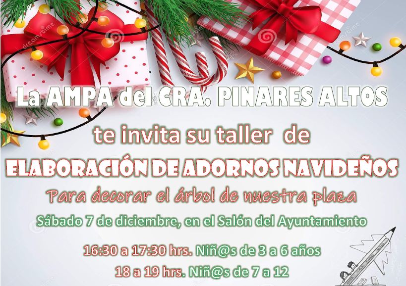 Las madres y padres del AMPA, realizarán un taller de decoración navideña, de forma sostenible y con material reutilizado. El taller se dividirá en dos sesiones dependiendo de la edad, tendrán lugar en el salón de actos del Ayuntamiento de Vinuesa. Los más pequeños además de pasar un divertido rato de ocio y divertirse con más niños y madres y padres, aprenderán nuevas técnicas de manualidades, ha reutilizar material reciclado y formarán parte de la labor de decorar el arbol de Navidad de la Plaza Mayor del pueblo, en el que se lucirán durante todas las fiestas sus preciosos adornos.