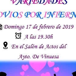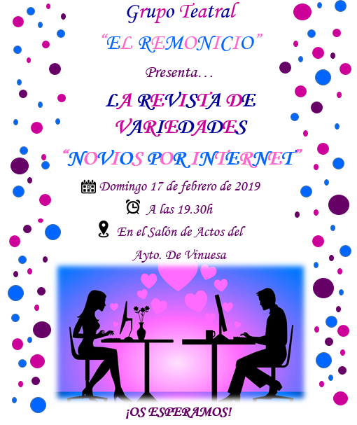 Este Domingo, 17 de Febrero, en el Salón de Actos del Ayuntamiento de Vinuesa, a las 19.30h, nuestros paisanos del Grupo Teatral "El Remonicio" nos presentan en Revista de Variedades "Novios por Internet" una comedia cargada de humor que nos hará pasar un rato de lo más agradable.